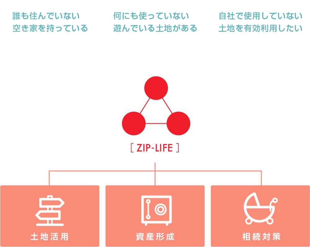 賃貸物件をお探しの方、また所有している不動産を賃貸物件としてご活用いただきたい方はジップライフにご相談ください。入居者サポートから物件管理まで建物に関するサポートを幅広く行います。